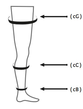 Para escolher o tamanho correto é necessário medir a circunferência da perna (em centímetros) nos pontos indicados abaixo: